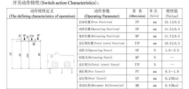Mikrospínač Specifikace