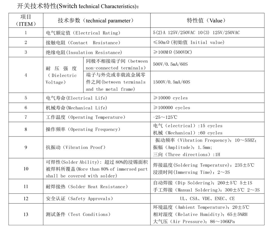 | 1 | Elektrické hodnocení | 5(2)A 125V/250VAC 10(3)125V/250VAC | |